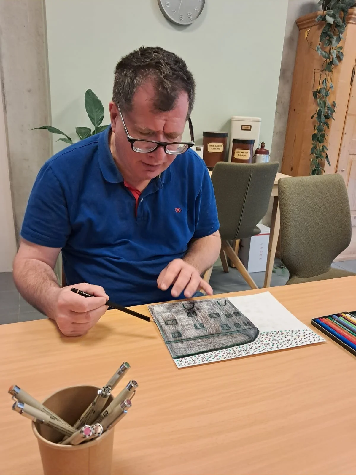 Uwe ist mit über 50 der älteste ARTquer Künstler. Er ist schon lange bei der Lebenshilfe und seit vielen Jahren bei ARTquer. Unzählige Mäuse und Ratten hat er aus Holz geschnitten, geschliffen und bemalt. Er zeichnet auch gerne sehr kleinteilige Stadtpläne, Häuser, Insektenschwärme, Orchester und Hans-Christian Andersen.